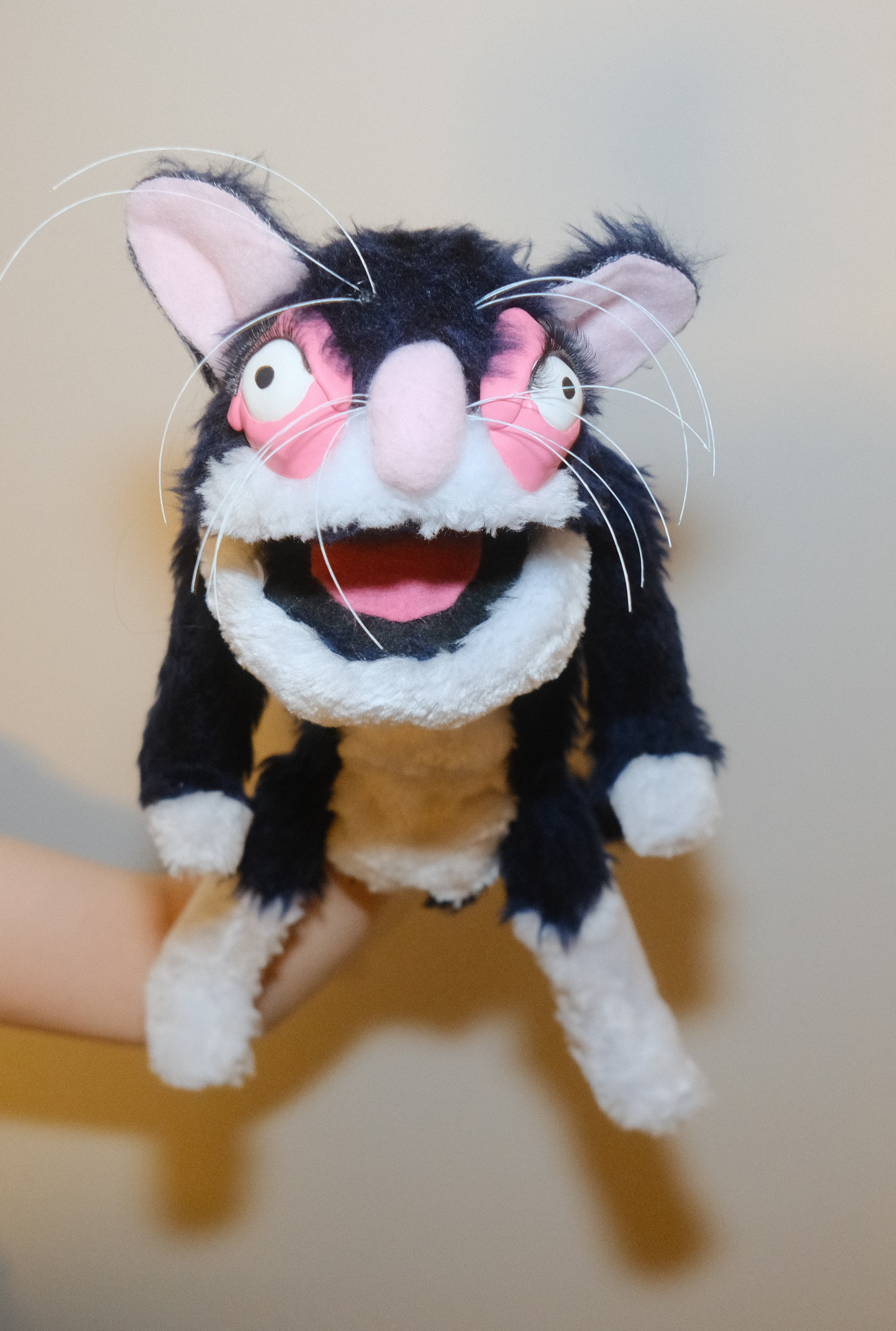 Covered in fleece, felt, fur, stuffing, and polymer clay.